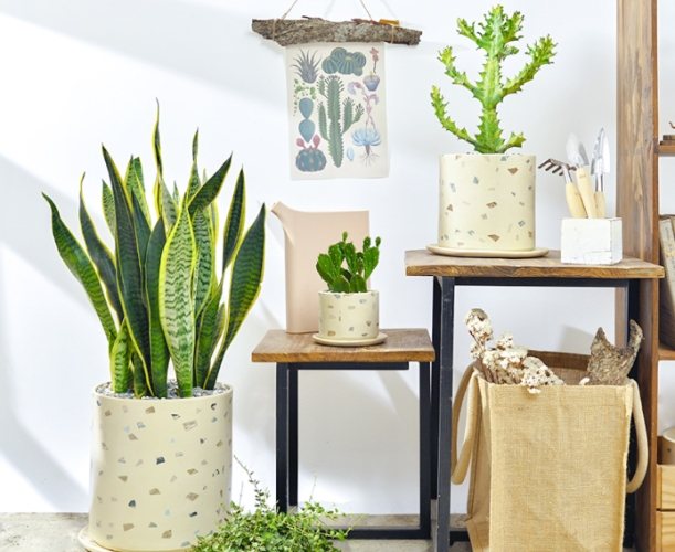 • 套盆 (Cache Pot): 我的最愛!把塑膠盆放進無孔的漂亮外盆裡。澆水方便,隨時可以檢查內盆狀態,髒了也方便清理。空間夠的話,底部還可以放些陶粒增加隔水層。