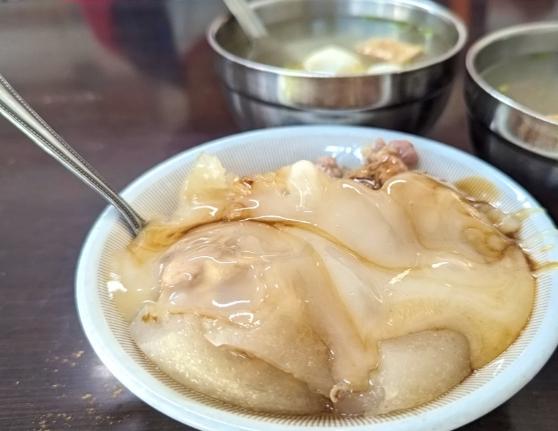 介紹:這攤沒有顯眼的招牌,但攤位上擺滿了黃澄澄的粉粿和透亮的粉條就很吸睛!老闆娘每天手工製作,粉粿口感超Q彈,帶著淡淡的焦糖香氣(傳統用黃梔子染色),粉條則是滑溜順口。可以買整塊回家自己切,也可以現場請老闆娘切塊加糖水或剉冰當場吃。純粹的古早味甜點,簡單卻迷人。