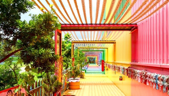 1. 七彩彩虹隧道: 一進門就先被震撼!整條長廊掛滿了成千上萬條各種顏色、寬度的緞帶,像瀑布一樣從天而降,陽光一照進來,光影變化美到不行!絕對是IG打卡第一熱點,怎麼拍都夢幻。記得走到最裡面回頭拍,效果更贊。小朋友在這區通常會嗨到瘋掉,瘋狂穿梭在綵帶雨中。